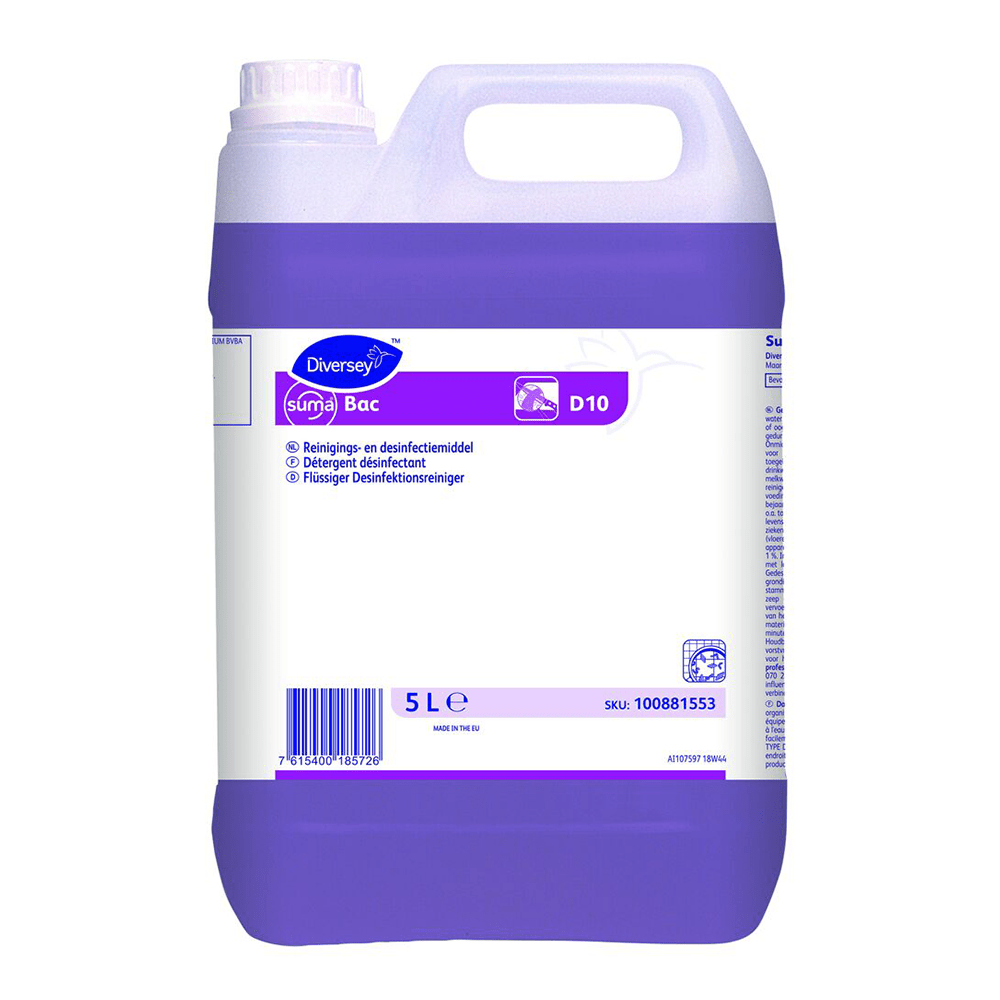 Suma Bac D10 is een geconcentreerde desinfecterende reiniger die alle oppervlakken in de keuken in één keer reinigt en desinfecteert. De formule is samengesteld uit quaternaire ammoniumverbindingen, sequestreermiddelen en een buffersysteem, waardoor het product bijzonder effectief is tegen een breed spectrum aan micro-organismen. De formule bevat oppervlakteactieve stoffen die reiniging en desinfectie in één keer mogelijk maken, ongeacht de waterhardheid. Suma Bac conc D10 conc wordt gedoseerd met het Divermite-doseersysteem van Diversey.